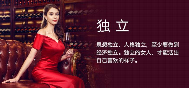 一、獨立:獨立的女性總是那么的吸引人,獨立的女性能夠活出自己的風采,思想上的獨立和人格上的獨立造就了女性不同的魅力,讓人心生愛慕。如同紅酒,每一款都有著其獨特的香氣,讓紅酒愛好者迷醉其中。