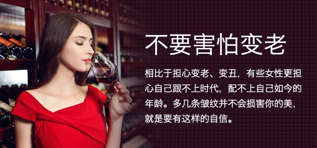 七、不要害怕變老:時間會改變?nèi)蓊?,葡萄酒也會隨著時間的流逝而改變其本身瑰麗的色澤。每一位女性就像一瓶瓶具有陳年價值的紅酒,在最初釀制的酸澀,如女性青春年少的清新自然;而后陳年到最佳適飲年份,這時候的紅酒就像到了最具女性魅力的黃金年華,端莊優(yōu)雅;再隨后這瓶葡萄酒陳年變成了老酒,這時候的葡萄酒雖然過了最佳適飲年份,風味卻更加的復(fù)雜,不少紅酒愛好者都不遺余力的追逐這些陳年老酒。而這時候的女性因為時間、閱歷的沉淀,沒有了青澀,卻更加大氣,貴氣自生。