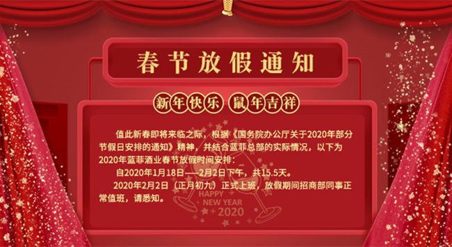 自2020年1月18日——2月2日上午,共15.5天,為藍(lán)菲酒業(yè)春節(jié)假期,于2月2日下午13: 30 (正月初九)正式上班,放假期間公司安排人員正常值班,請(qǐng)悉知。